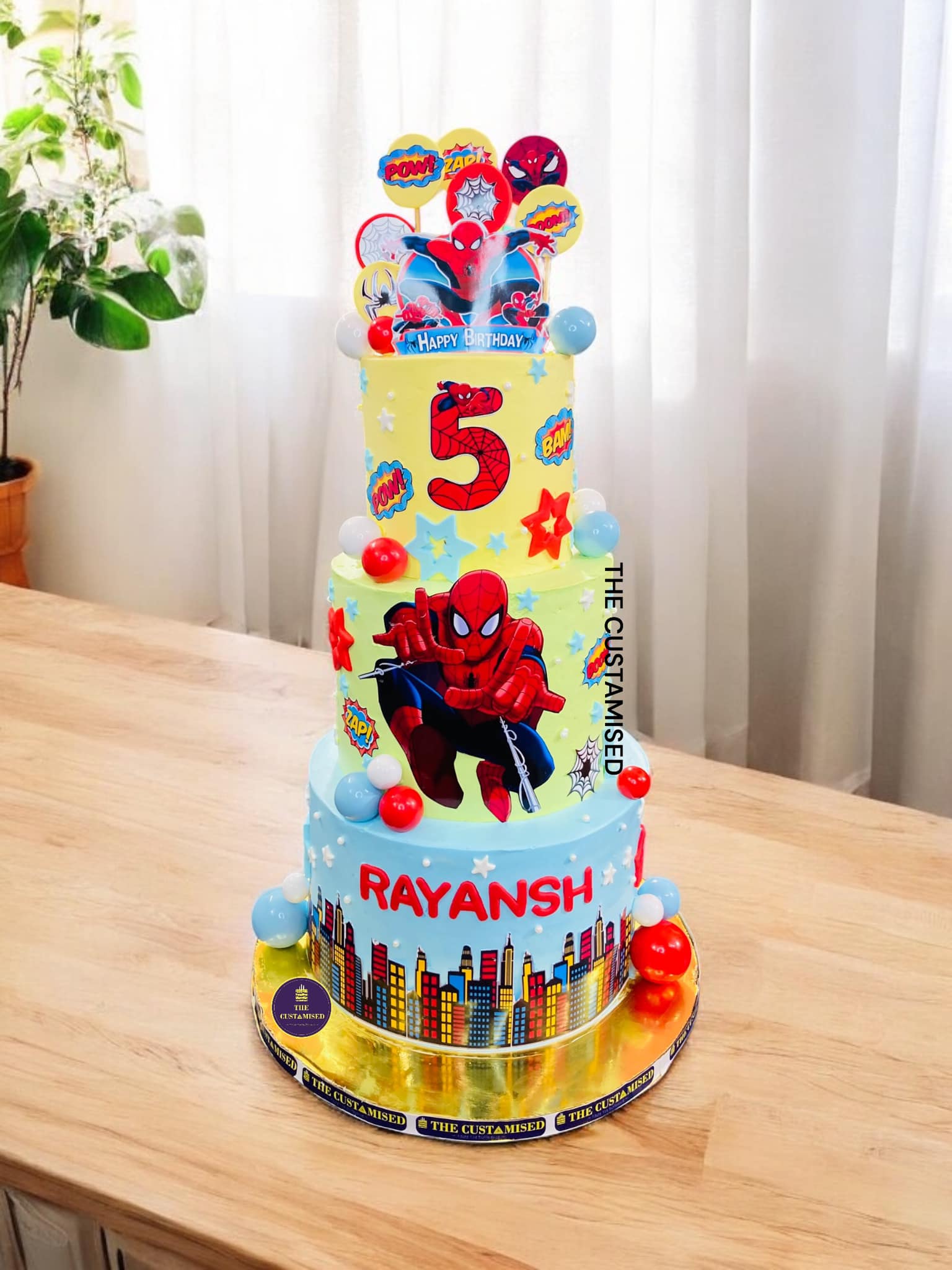 Unleash the hero within with our spectacular three-tiered Spiderman themed birthday cake! This action-packed cake features vibrant non-edible images of iconic heroe Spider-Man. Adorned with explosive "BOOM!", "POW!", and "BAM!" comic-style bursts, a bold age "5" topper (customizable), and a "HAPPY BIRTHDAY" banner. Customizable with a name (e.g., "Debomos"), it's the ultimate centerpiece for any aspiring superhero's celebration!