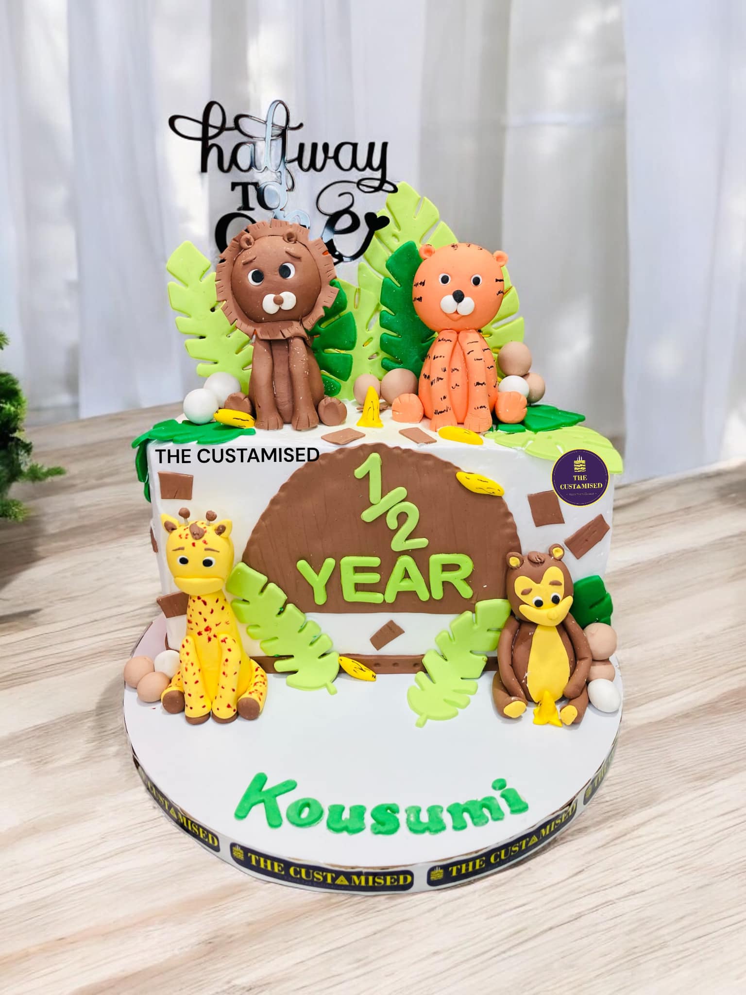 Celebrate your little one's "halfway to one" milestone with this adorable and customisable Jungle Safari themed cake! Perfect for a 6-month birthday celebration, this cake features charming handcrafted edible animal figures including a friendly lion, a playful tiger, a cute giraffe, and a mischievous monkey, surrounded by vibrant green fondant leaves and other jungle elements.